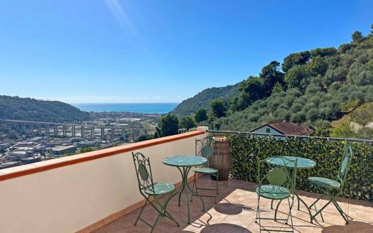 A convenient internal masonry staircase leads to the first floor of this villa for sale in Camporosso, divided into a large room currently used as a living room with kitchenette and terrace, a bedroom, an accessory room perfect as a walk-in closet, a storage room, a bathroom, and a second terrace with panoramic views of the hills. From this floor, the staircase continues to the turret, which features a room that can be used as a study and the most impressive terrace with a 360° view.